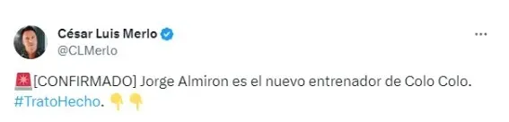 El ex entrenador de Boca, Jorge Almirón, es el nuevo entrenador de Colo Colo. El finalista de América llegó a un acuerdon con el conjunto chileno y firmó por 2 años con el Cacique según pudo revelar el periodista César Luis Merlo.