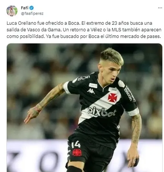 El ex Vélez, Luca Orellano, fue ofrecido a Boca. La información fue revelada por el periodista Facundo Pérez quien citó que el delantero busca su salida de Vasco da Gama y el Xeneize aparece como un probable destino.