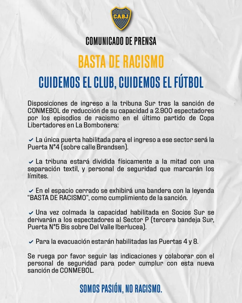 “Boca le dice no al racismo. Cuidemos el club, cuidemos el fútbol” fue el mensaje que bajaron desde Brandsen al 805 de cara al próximo partido por la competencia internacional.