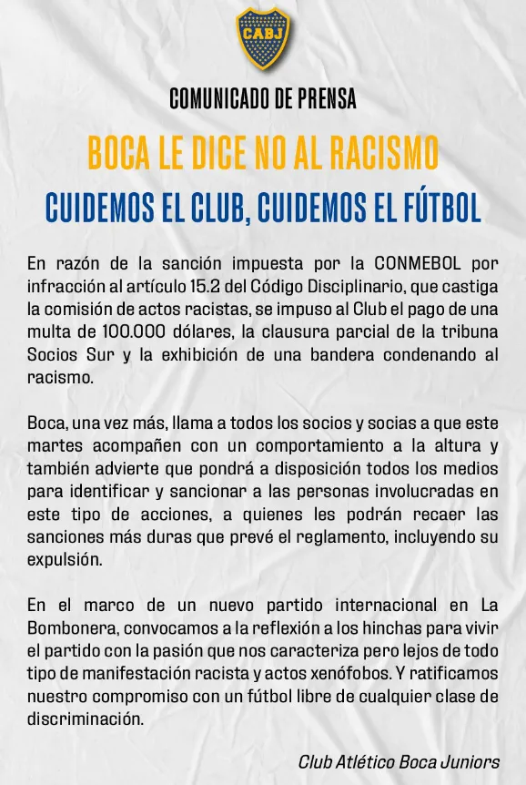 “Boca le dice no al racismo. Cuidemos el club, cuidemos el fútbol“, fue el título elegido para el comunicado. En él se enumeran las sanciones que Boca sufrió por hechos ocurridos en la última edición de la Copa Libertadores, particularmente en la semifinal frente a Palmeiras.