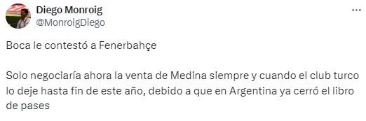 Según informó el periodista Diego Monroig, la dirigencia ya le respondió a esta institución e indicó que “solo lo negociaría ahora la venta de Medina, siempre y cuando el club turco lo deje hasta fin de año“. El motivo se debe a que el mercado de pases ya culminó en el fútbol argentino y no podría buscar a su reemplazante u otra opción en ese sector. Ahora, resta saber la postura de Fenerbahce.