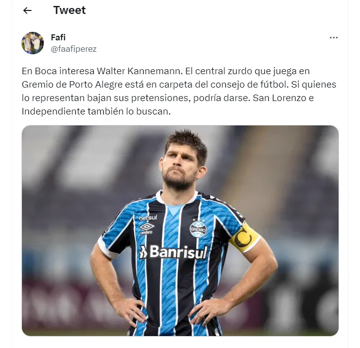 Al respecto, el periodista Facundo Pérez comentó que el defensor está en carpeta y si baja sus pretensiones podría llegar: “En Boca interesa Walter Kannemann. El central zurdo que juega en Gremio de Porto Alegre está en carpeta del consejo de fútbol. Si quienes lo representan bajan sus pretensiones, podría darse. San Lorenzo e Independiente también lo buscan”.