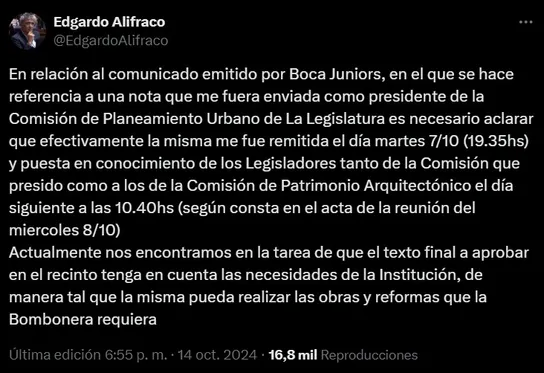 “En relación al comunicado emitido por Boca Juniors, en el que se hace referencia a una nota que me fuera enviada como presidente de la Comisión de Planeamiento Urbano de La Legislatura es necesario aclarar que efectivamente la misma me fue remitida el día martes 7/10 (19.35hs) y puesta en conocimiento de los Legisladores tanto de la Comisión que presido como a los de la Comisión de Patrimonio Arquitectónico el día siguiente a las 10.40hs (según consta en el acta de la reunión del miercoles 8/10)“, repasa el texto.