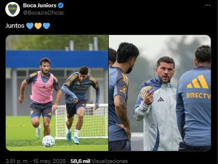 Luego de lo que se vivió en La Bombonera contra Lanús, desde el Xeneize insisten en unir a los hinchas. Lo hicieron nuevamente a través de la cuenta oficial, publicando fotos del entrenamiento y justamente del DT dando indicaciones. “Juntos”, fue la palabra elegida junto a corazones azules y amarillos.