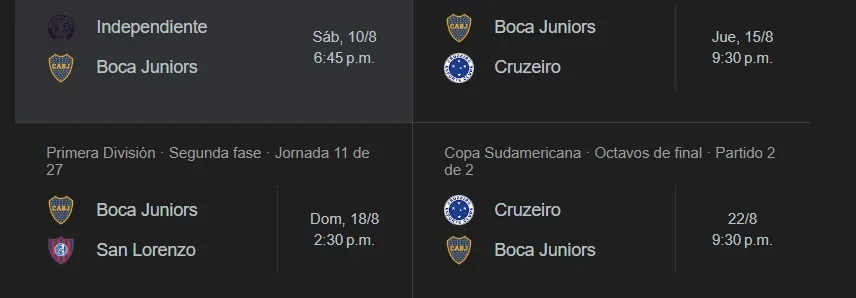 De esta manera, el Xeneize primero se enfrentará este sábado 10 de agosto contra Independiente Rivadavia de Mendoza como visitante. Después recibirá a Cruzeiro por Copa Sudamericana y a San Lorenzo por el torneo local. Y terminará esta seguidilla contra los brasileros de visitante el 22 de agosto.