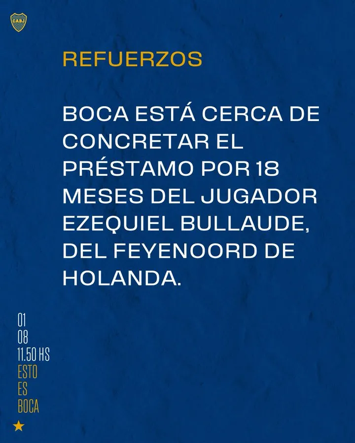 Cerca del mediodía, se anunció: “Boca está cerca de concretar el préstamo por 18 meses del jugador Ezequiel Bullaude, del Feyenoord de Holanda”. El volante ofensivo de 22 años emigró al viejo continente a mediados del 2022 luego de romperla en Godoy Cruz de Mendoza.