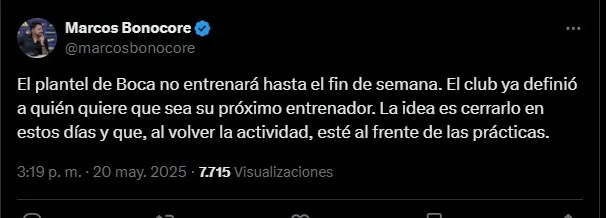 Sin embargo, ahora se reveló una nueva medida del cuadro de la Ribera con el plantel. Y según lo revelado por el periodista Marcos Bonocore, el plantel de Boca no entrenará hasta el fin de semana. Mientras que, por otro lado, la comisión de club ya habría elegido al nuevo DT y se espera que esté el frente de las próximas prácticas.