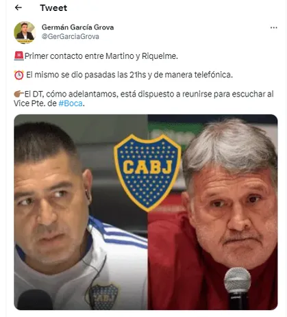 Las gestiones por el Tata ya iniciaron. Así lo reveló el periodista Germán García Grova: “Existió un primer contacto entre Juan Román Riquelme y Gerardo Martino. Se dio pasadas las 21, de manera telefónica. El DT está dispuesto a reunirse para escuchar al vicepresidente de Boca”.