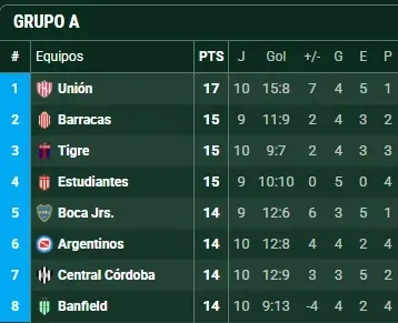La tabla de posiciones de la Zona A