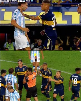 Otra fuerte entrada de "Maravilla" Martínez a Costa y Rey Hilfer le muestra la tarjeta amarilla. Todo Boca pide expulsión para el delantero de Racing.