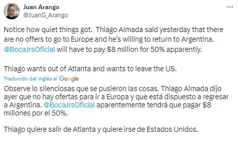 El periodista Juan Arango se refirió a este tema e indicó que el cuadro de la Ribera “tendrá que pagar 8 millones de dólares por el 50%”. Además, resaltó que el jugador en cuestión quiere salir de su club y quiere irse de Estados Unidos. Por su parte, el campeón del mundo en Qatar 2022 con la Selección Argentina reconoció el diálogo con Juan Román Riquelme. Solo resta saber la postura final del Xeneize y si decide levantar el teléfono para iniciar las gestiones.