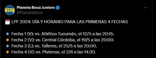 El debut de Boca en la Liga Profesional 2024 será ante Atlético Tucumán como visitante el próximo domingo 12 de mayo a las 20:15 horas de la noche. El estadio será Estadio Monumental José Fierro en la provincia de Tucumán.