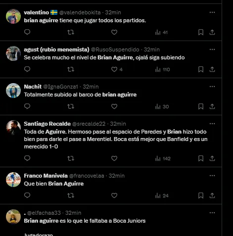 “Qué bien Brian Aguirre”, “Es lo que le faltaba al equipo”, “Se lo ganó”, “Excelente”, fueron algunos de los comentarios en X (Twitter) que recibió el futbolista por parte de los fanáticos.