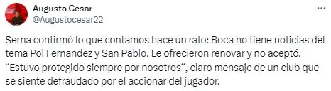 Estos actos por parte del ex Cruz Azul no habrían caído bien en el cuadro de la Ribera. El periodista Augusto César brindó más detalles e informó que “Boca no tiene noticias del tema Pol Fernández y San Pablo”. Además, hizo referencia a los recientes dichos de Mauricio Serna, integrante del Consejo de Fútbol, e indicó que una de estas declaraciones fue “el mensaje de un club que se siente defraudado por el accionar”.