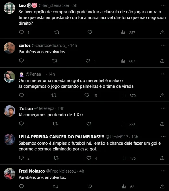 Las reacciones en las redes fueron de pura indignación. “Ya empezamos perdiendo”, “Sabemos cómo es el fútbol, hay chances de que haga el gol que nos elimine”, “Solo espero que Palmeiras no esté pagando parte de su salario, sería ridículo” y “Dirigencia imcompetente” fueron algunos de los comentarios.