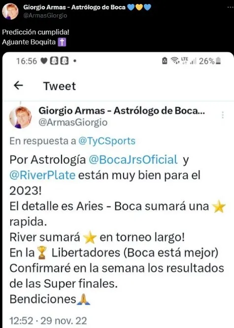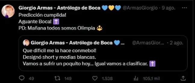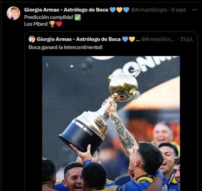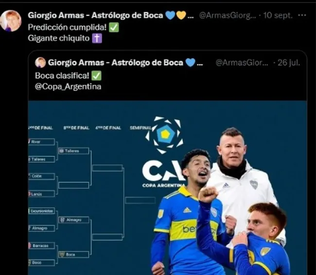 Giorgio Armas es un astrólogo y tarotista hincha de Boca quien ha predicho a lo largo de estos últimos meses varios resultados del xeneize de manera exitósa. A su vez, el mismo mantiene una relación de amistad con Jorge Almirón desde hace años.