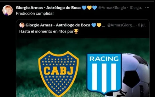 Hace ya varias semanas que el mundo Boca se ha hecho consciente de la presencia de Giorgio Armas, reconocido astrólogo y tarotista xeneize, quien ha acertado previamente los resultados del conjunto de la Ribera. De esta forma, en el día de la fecha, el hombre en cuestión dio su pronóstico para el cruce frente a Central Córdoba con una particularidad.
