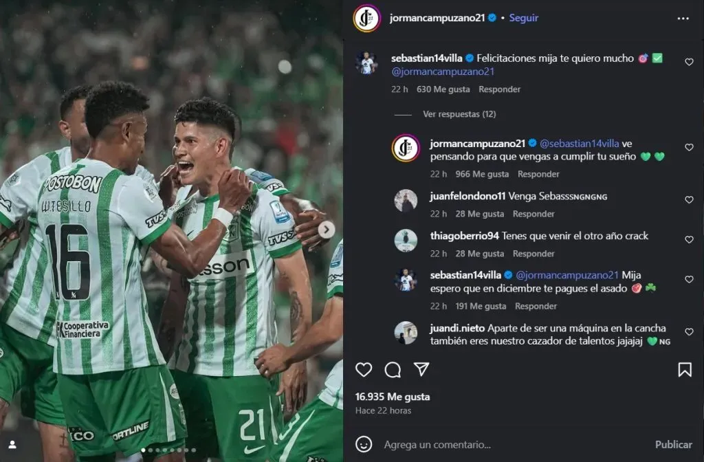 Y no todo quedó ahí. El volante, con pasado en Giresunspor, atento al comentario del atacante de Independiente Rivadavia, le abrió las puertas de Atlético Nacional. “Ve pensando para que vengas a cumplir tu sueño“, escribió Jorman, dejando entrever el fanatismo del exBoca por el cuadro de Medellín y los pedidos de varios usuarios para que se sume a ese plantel.