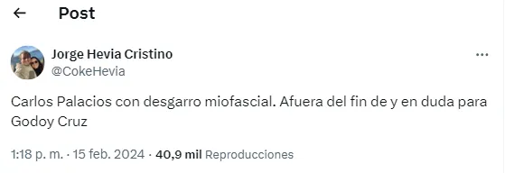 Carlos Palacios se desgarró en la misma semana que rechazó a Boca