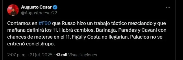 Cabe recordar que contra Unión el chileno jugó los 90 minutos del partido. Mientras que, en la primera fecha contra Argentinos, el delantero se fue reemplazado en el segundo tiempo tras su flojo rendimiento.