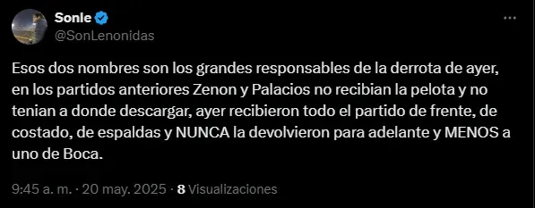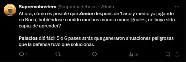 “Todo el partido con miedo jugaron” y “Realmente lo peor que le puede pasar a un hincha viendo a su club es tener en el mismo equipo a 2 cobardes tan asustados y tan amargos como Zenón y Palacios“, fueron tan solo algunos de los comentarios con ambos protagonistas.
