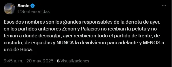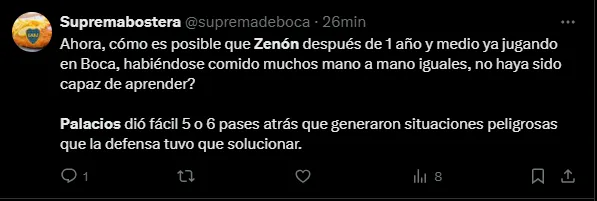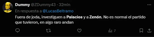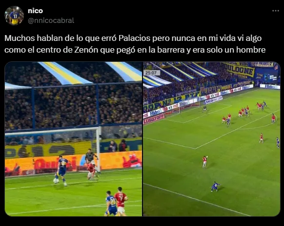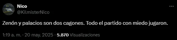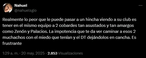“Todo el partido con miedo jugaron” y “Realmente lo peor que le puede pasar a un hincha viendo a su club es tener en el mismo equipo a 2 cobardes tan asustados y tan amargos como Zenón y Palacios“, fueron tan solo algunos de los comentarios con ambos protagonistas.