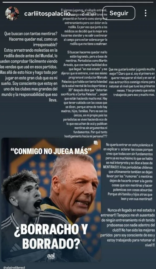 Ante los rumores por su ausencia en la lista de concentrados del partido de Boca vs. Atlético Tucumán, Carlos Palacios subió una polémica historia a su Instagram personal. En donde, entre otras palabras, confirmó que la verdadera razón por la que no viajó a Santiago del Estero es por su lesión en la rodilla (en conferencia de prensa después de la derrota, Russo no quiso tocar el tema y rechazó hablar sobre Palacios).
