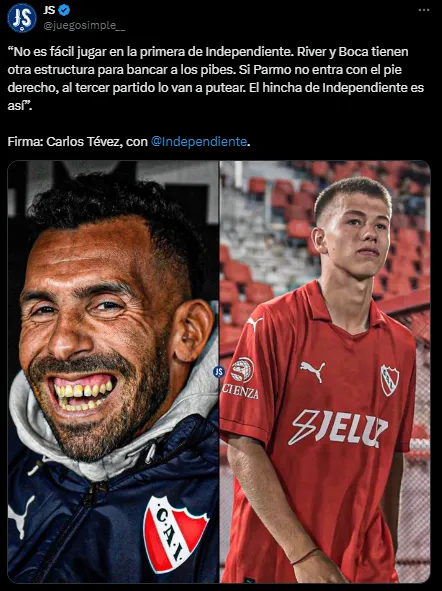 En diálogo con el canal oficial de Independiente, Tevez explicó que son distintos los procesos juveniles en Boca y el Rojo. “No es fácil jugar en la primera de Independiente. River y Boca tienen otra estructura para bancar a los pibes“, sostuvo. Luego, hizo énfasis en la hinchada y dijo: “Si Parmo (joven que aún no debutó en Primera) no entra con el pie derecho, al tercer partido lo van a putear. El hincha de Independiente es así”.