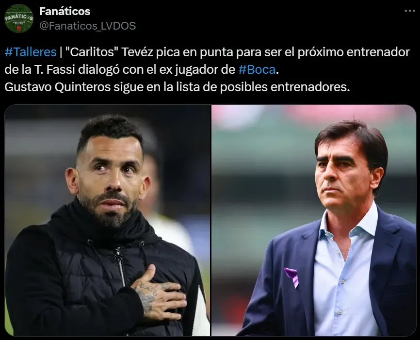 Mientras Boca se encuentra en la búsqueda de un sucesor para Gago, no es el único equipo que atraviesa la misma situación. Talleres de Córdoba, que no pasa un buen momento futbolístico, también está analizando entrenadores para que asuma tras la salida de Pablo Guiñazú como interino. En ese sentido, Tevez aparece como la principal opción.