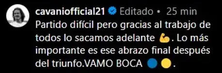 El Matador, que aún no pudo ponerle fin a su sequía goleadora, publicó dos imágenes del partido contra el Guapo y allí rescató un aspecto en lo colectivo. “Partido difícil pero gracias al trabajo de todos lo sacamos adelante. Lo más importante es ese abrazo final después del triunfo. VAMO BOCA”, escribió el Matador.