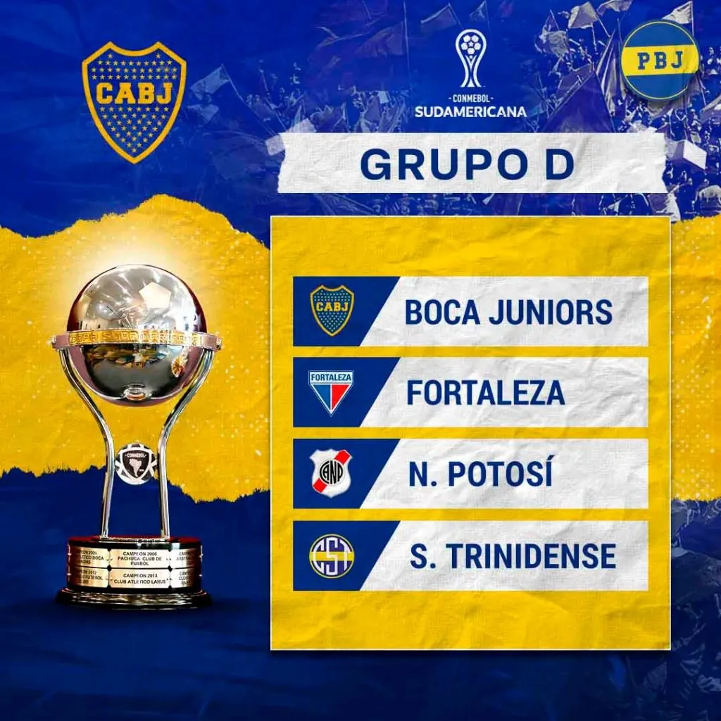 Se sortearon los grupos de la Copa Sudamericana 2024 y Boca ya conoce a sus rivales para el torneo continental que jugará en esta temporada. El Xeneize se enfrentará a Nacional Potosí (Bolivia), Fortaleza (Brasil) y Sportivo Trinidense (Paraguay) en esta primera etapa del campeonato. Clasifican los dos mejores.