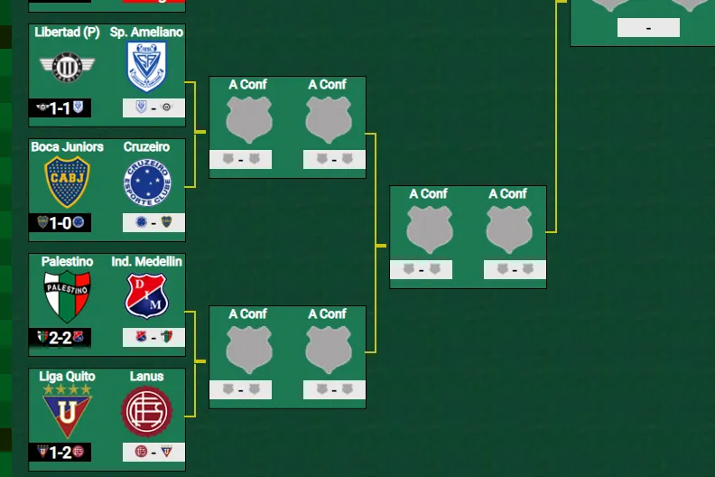 El ganador de Liga y Lanús se enfrentará a Palestino o Independiente Medellin (igualaron 2-2 en la ida). Uno de esos cuatro será el rival de semifinales de Boca, Cruzeiro, Libertad o Sportivo Amelliano. Uno de esos 8, estará en la final en Asunción el 23 de noviembre.