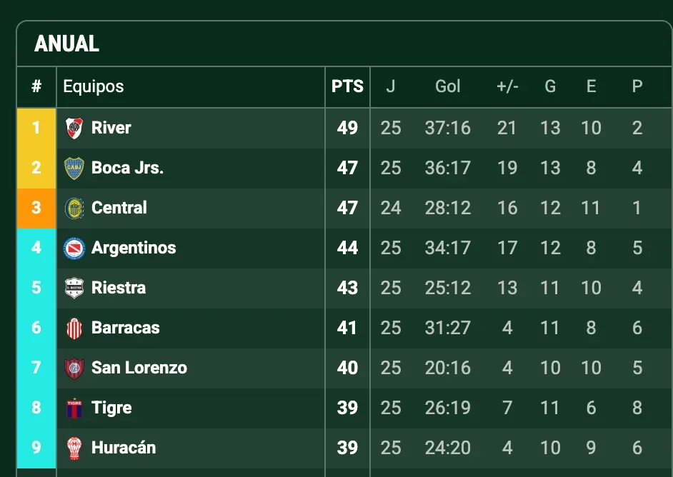 Actualmente, River es el líder de la tabla anual del torneo argentino con 49 unidades a 6 fechas del final. Y por debajo aparece Boca con 47 unidades, por lo que de momento el Xeneize también está clasificando de manera directa a la Copa Libertadores.