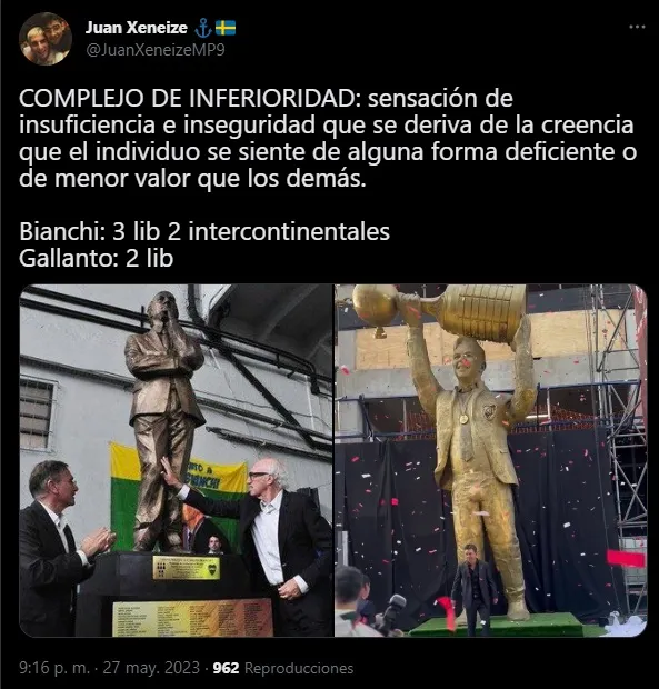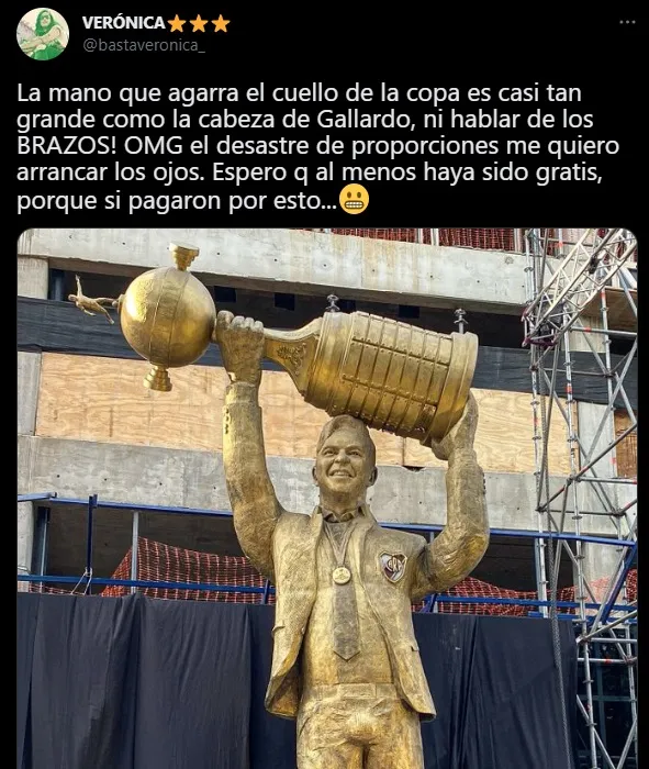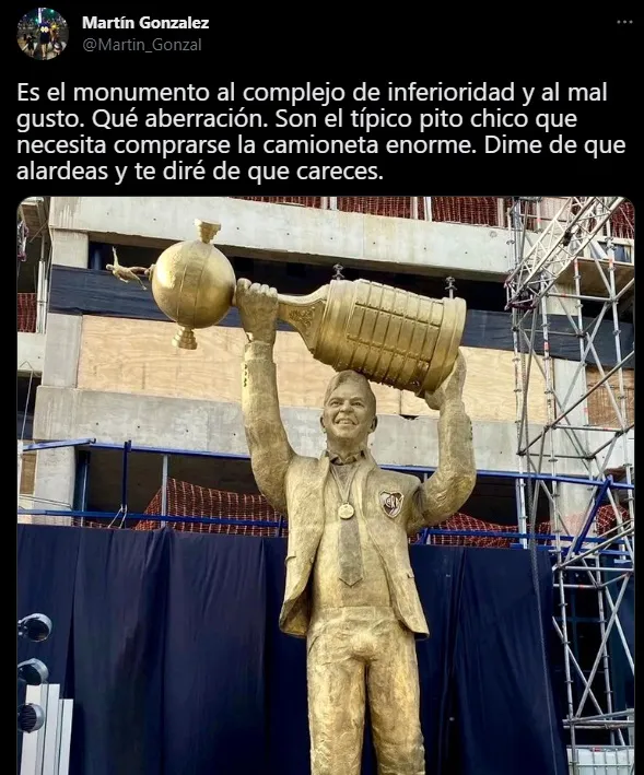 Luego hubo comparaciones con el monumento que hace ya varios años Boca hizo para Carlos Bianchi. Una imagen con estatura acorde, con una postura épica del “Virrey”. El mensaje es claro: muchos adjudicaron un “complejo de inferioridad” a la decisión de hacer la estatua de Gallardo tan alta (mide 8 metros).