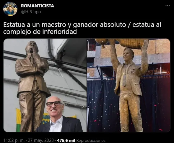Lo primero que detectaron los hinchas de Boca fue que la cara de la estatua es más parecida a la del famoso abogado Fernando Burlando que al exDT de River. Y por ahí se direccionaron las primeras burlas (hasta el propio Burlando se rió del tema). También por las dimensiones del cuerpo de la estatua: las manos son iguales de grandes que la cabeza.