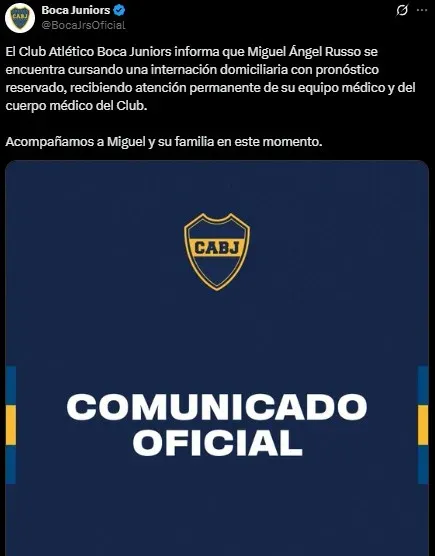 “El Club Atlético Boca Juniors informa que Miguel Ángel Russo se encuentra cursando una internación domiciliaria con pronóstico reservado, recibiendo atención permanente de su equipo médico y del cuerpo médico del Club. Acompañamos a Miguel y su familia en este momento”.