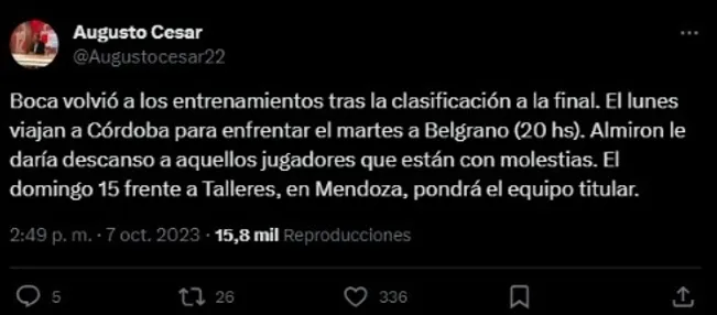 Y es que, en la semana, el periodista Augusto César había informado: “Almiron le daría descanso a aquellos jugadores que están con molestias“. Además agregó: “El domingo 15 frente a Talleres, en Mendoza, pondrá el equipo titular” (Copa Argentina).