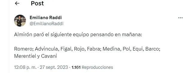 Los once de Almirón, pensando en Palmeiras: Sergio Romero; Luis Advíncula, Nicolás Figal, Marcos Rojo, Frank Fabra; Cristian Medina, Ezequiel Fernández, Guillermo Fernández, Valentín Barco; Miguel Merentiel y Edinson Cavani.