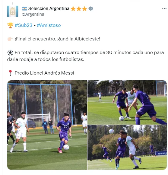 En un formato atípico, pensando especialmente para darle rodaje a todos los convocados, las selecciones jugaron cuatro tiempos de 30 minutos. ¿El resultado? Argentina ganó 2-1 con goles de Luciano Gondou y Alan Velasco.