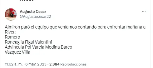 El probable once para visitar a River: Sergio Romero; Facundo Roncaglia, Nicolás Figal, Nicolás Valentini; Luis Advíncula, Pol Fernández, Alan Varela, Cristian Medina, Valentín Barco; Sebastián Villa y Luis Vázquez.