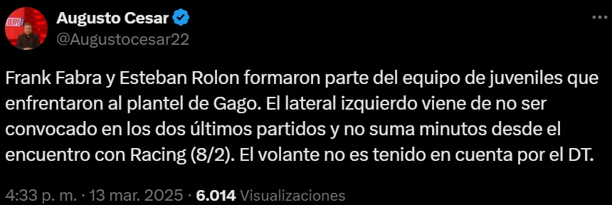 El periodista Augusto César reveló en su cuenta de X (Twitter) que el jugador cafetero formó parte del equipo de juveniles que enfrentó al plantel de Gago. El lateral izquierdo viene de estar ausente en las últimas listas de convocados, y todo parecería indicar que perdió mucho terreno en la consideración del DT, ante esta nueva decisión.