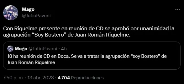 Y un hecho significativo ocurrió este jueves por la tarde, en la reunión de comisión directiva que contó con la presencia de Riquelme. Allí se definió un aspecto clave para él, según contó el periodista Julio Pavoni: “Con Riquelme presente en reunión de CD se aprobó por unanimidad la agrupación ‘Soy Bostero’ de Juan Román Riquelme”.