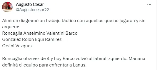 En la mañana de este jueves, Almirón hizo un trabajo práctico y paró un equipo que sorprendió. El mismo no tuvo arquero y formó con Facundo Roncaglia, Aaron Anselmino, Nicolás Valentini, Valentín Barco; Diego González, Esteban Rolón, Ezequiel Fernández, Juan Ramírez; Nicolás Orsini y Luis Vázquez.