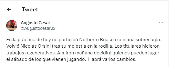 La aparición de Nicolás Orsini sorprendió a todos y tiene un por qué: el delantero no venía siendo convocado por un problema en su rodilla y ahora gana lugar porque el que está con molestias es Norberto Briasco. Aunque el once no está confirmado: “Los titulares hicieron trabajos regenerativos. Almirón mañana decidirá quienes pueden jugar el sábado de los que vienen jugando”, repasó el periodista Augusto César.