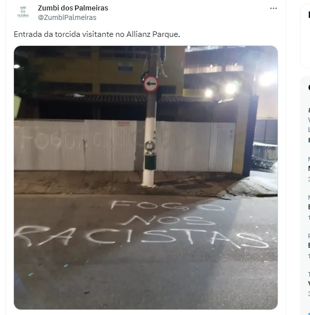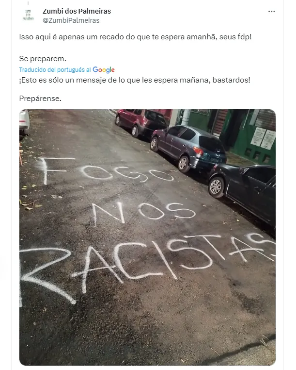“Fuego a los racistas”, fue la fuerte pintada que apareció en la entrada de la tribuna visitante y fue difundida por distintas cuentas dedicadas a la hinchada del Palmeiras a horas del arranque del partido. Como es costumbre, los fuegos artificiales se hicieron escuchar en el hotel de Boca en la noche previa.