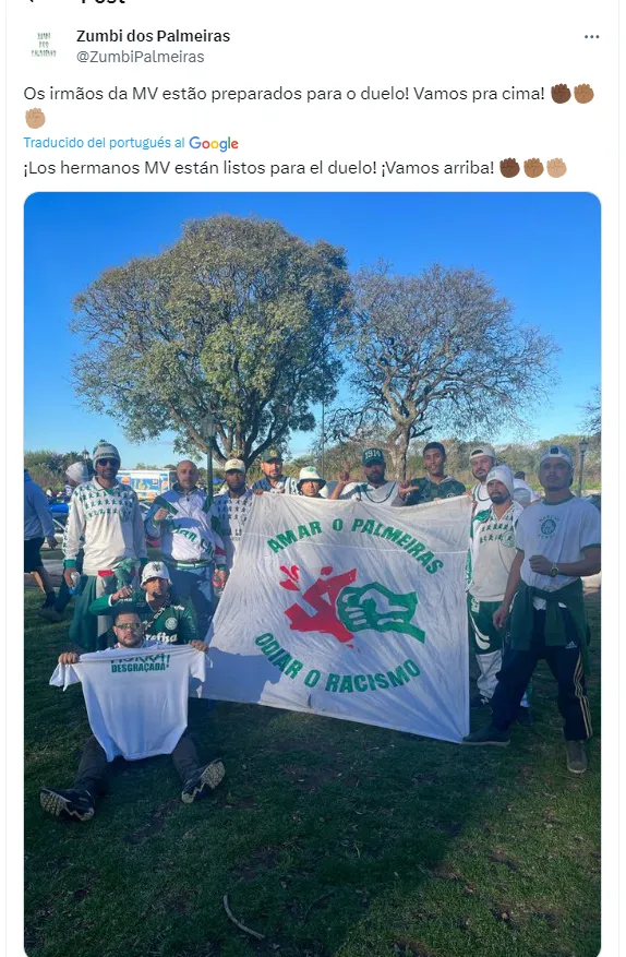 Como si fuera una guerra entre hinchadas, le cuenta ‘Zumbi Palmeiras’ escribió: “Los hermanos MV están listos para el duelo. Vamos arriba”. Y en respuesta a un hincha de Boca retrucaron: “Esto es solo un mensaje de lo que los espera, bastardos. Preparensé”.