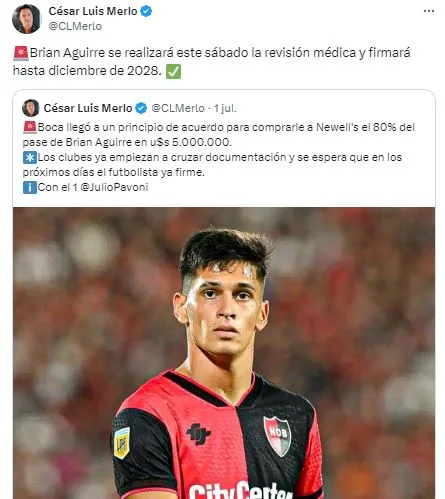 De acuerdo a la información que brindó César Luis Merlo, el delantero se convirtió en la incorporación del club a cambio de 5 millones por el 80% del pase. Además, la fuente citada mencionó que esté sábado se hará la revisión médica y firma de contrato hasta diciembre de 2028.