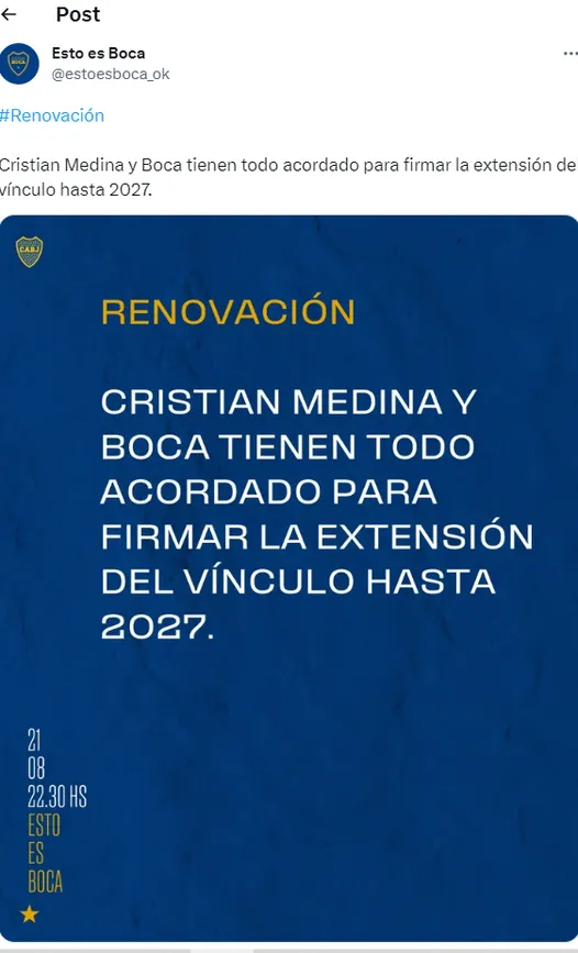 Lo informó el propio club de manera sorpresiva a través de su cuenta informativ ‘Esto es Boca Fútbol’. “Cristian Medina y Boca tienen todo acordado para firmar la extensión del vínculo hasta 2027″.