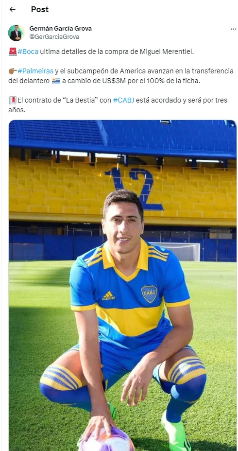 “Boca ultima detalles de la compra de Miguel Merentiel. Palmeiras y el subcampeón de América avanzan en la transferencia del delantero uruguayo a cambio de 3 millones de dólares por el 100%”, reveló el periodista Germán García Grova. Y agregó: “El contrato de la Bestia está acordado y será por tres años”.