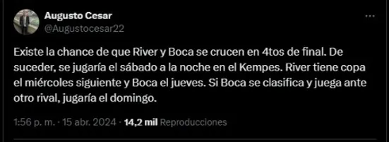 La información fue revelada por el periodista Augusto César, fuente que remarcó que en caso de que se dé un Boca vs. River en cuartos de final de la Copa de la Liga el partido se jugaría el sábado 20 de abril a la noche en el estadio Mario Alberto Kempes.